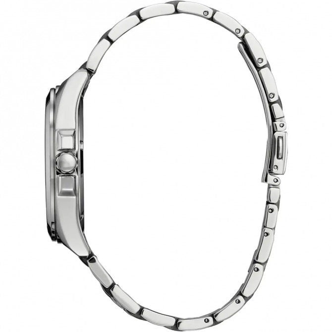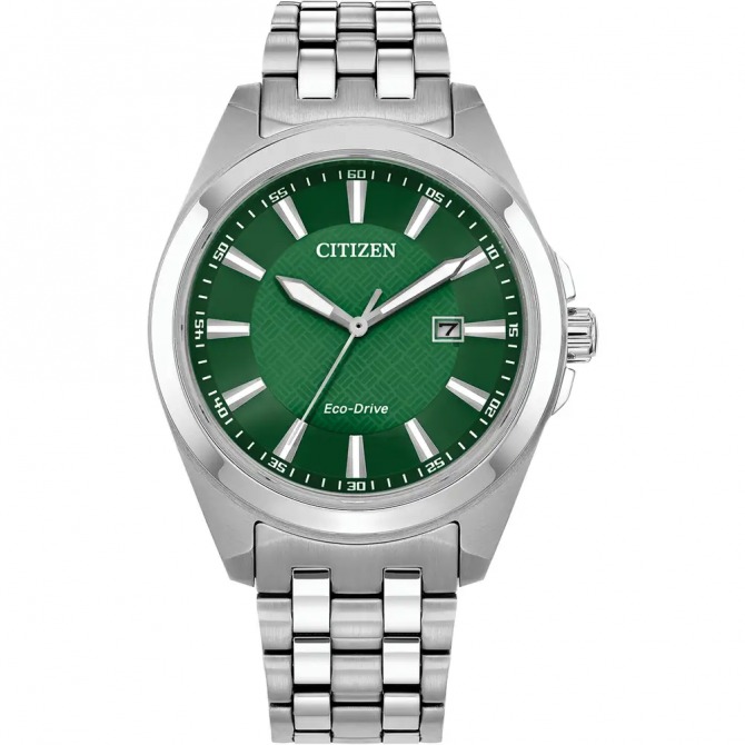 Styled in stainless steel with a striking green dial, this timepiece effortlessly completes any look. This 3-hand timepiece features silver-tone luminous hands and markers, sapphire crystal and date display at the 3 o’clock position. Sustainably powered by any light with our Eco-Drive technology.