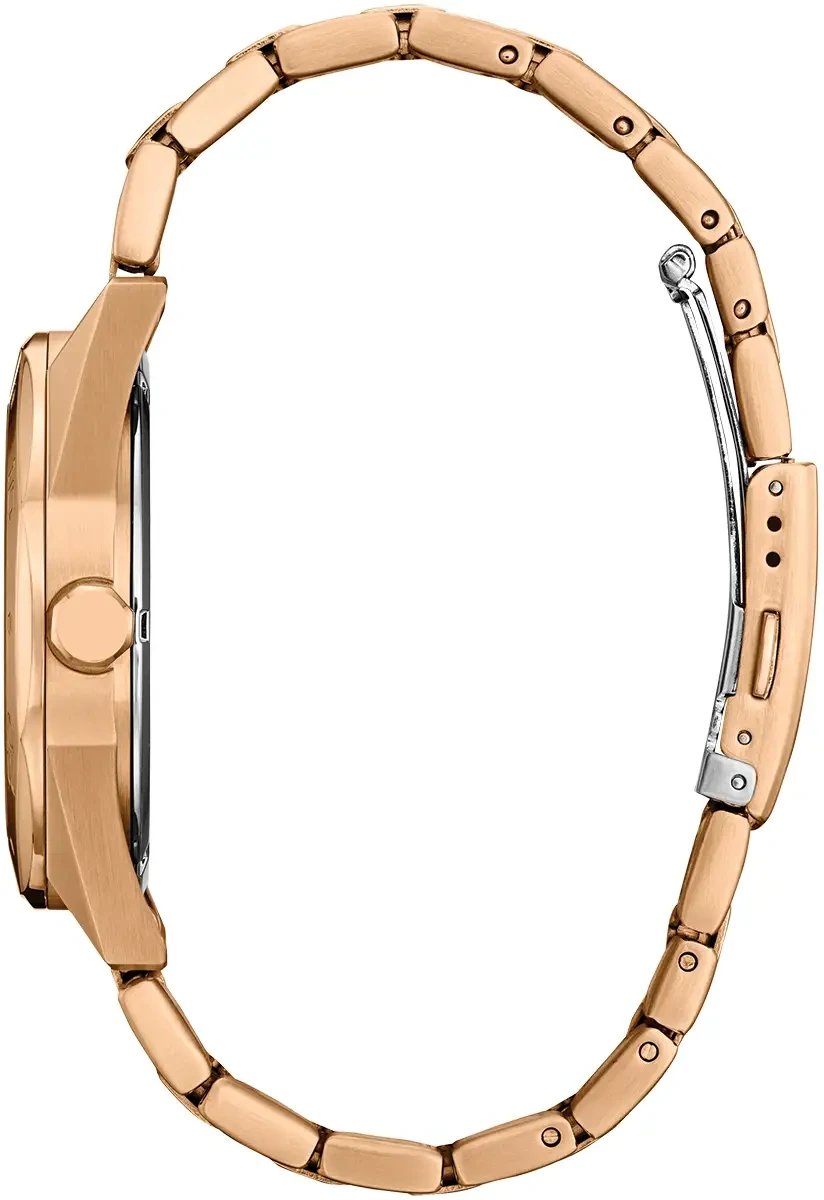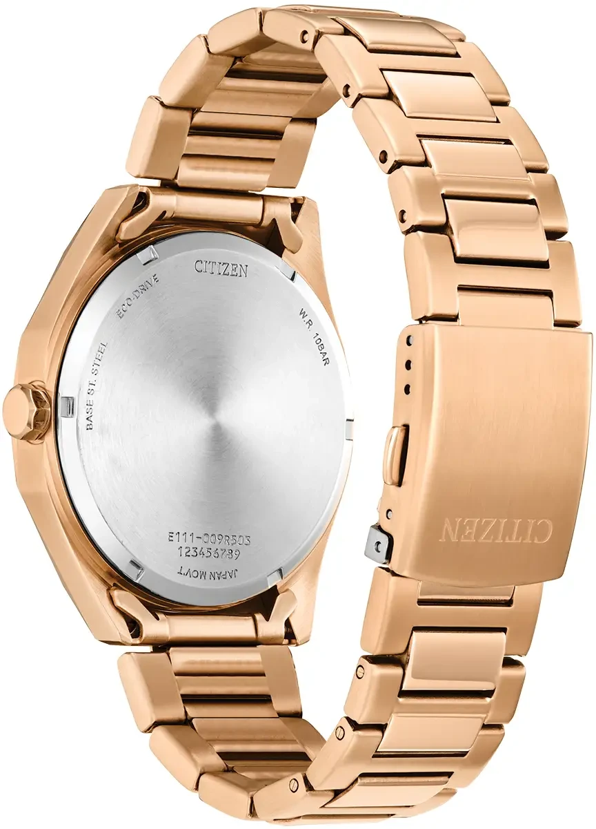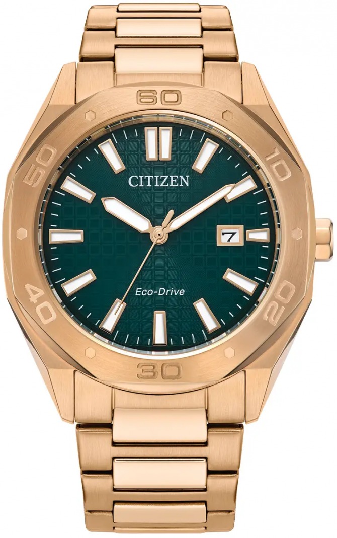 Confidently go from work to play with this Men's Sport. Featuring a rose gold-tone stainless steel case, the sports-focused timepiece makes use of sharp lines and contrasting styling to make a statement on the wrist. A faceted 60-minute bezel, H-link bracelet, and 100m water resistance ensure all-purpose wear. On the dial, a textured green display is presented, with applied indices alongside a 3 o'clock date window providing high legibility and daily utility. Featuring Citizen's Eco-Drive technology, sustainably powered by any light and never needs a battery.