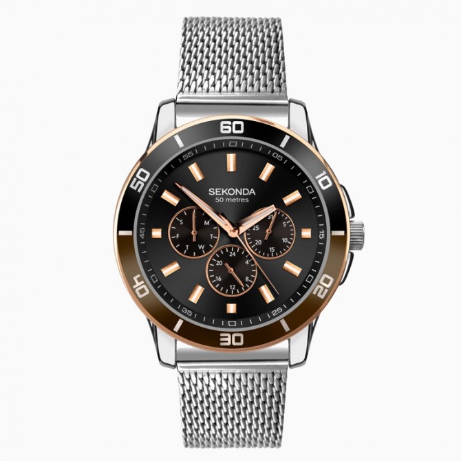 This watch features a round ionic plated silver and rose gold coloured case with a black & brown bezel enclosing a black sunray dial with multifunction subdials. The timepiece is fastened with a stylish stainless steel Milanese bracelet and has water resistance to 50 metres.