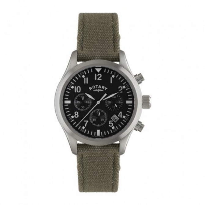 Rotary watch with stainless steel case & green fabric strap, with traditional buckle. Quartz battery operated with black dial, luminous white hour markers and 3 hands. 1/1 second chronograph displayed on 2 smaller sub dials and a third sub dial for 24 hour time. Date at 4 O'Clock position. 100M water resistant - suitable to jump into a swimming pool.