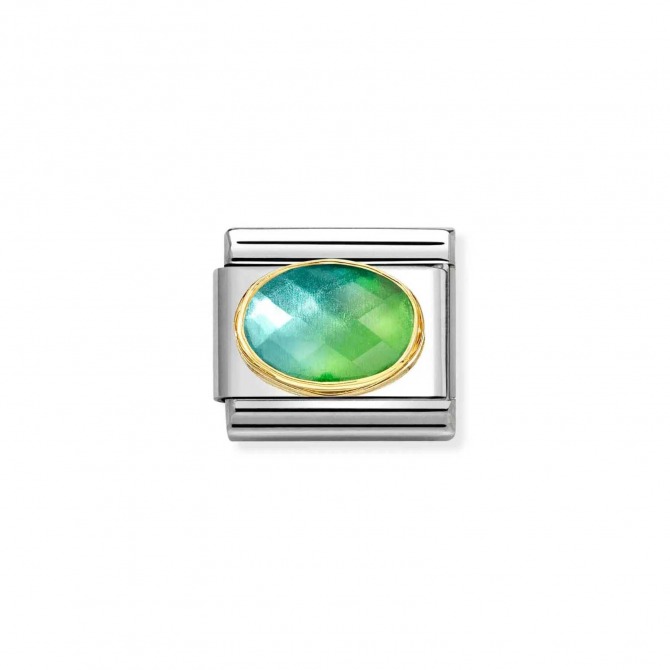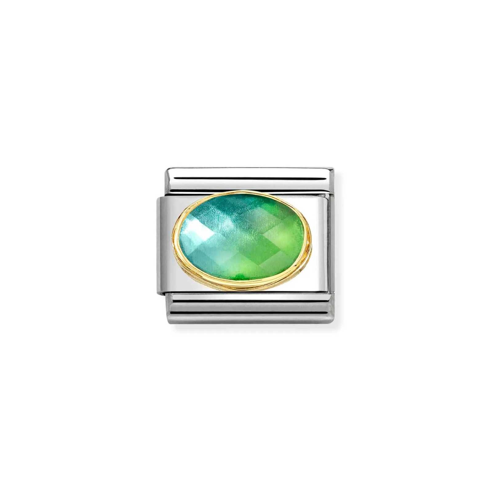 Original Nomination Classic Link in stainless steel with two-tone Blue-Green faceted glass stone. The stone is hand-set in yellow bonded gold setting. Alternate this luminous stone link with other symbols that tell the story of your life, what you love and what you want to do and create a bracelet that is unique, just like you!