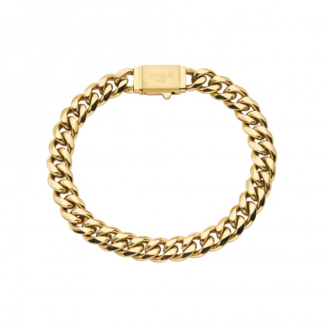 Stainless steel with gold plate curb bracelet, measures 21cm in length.