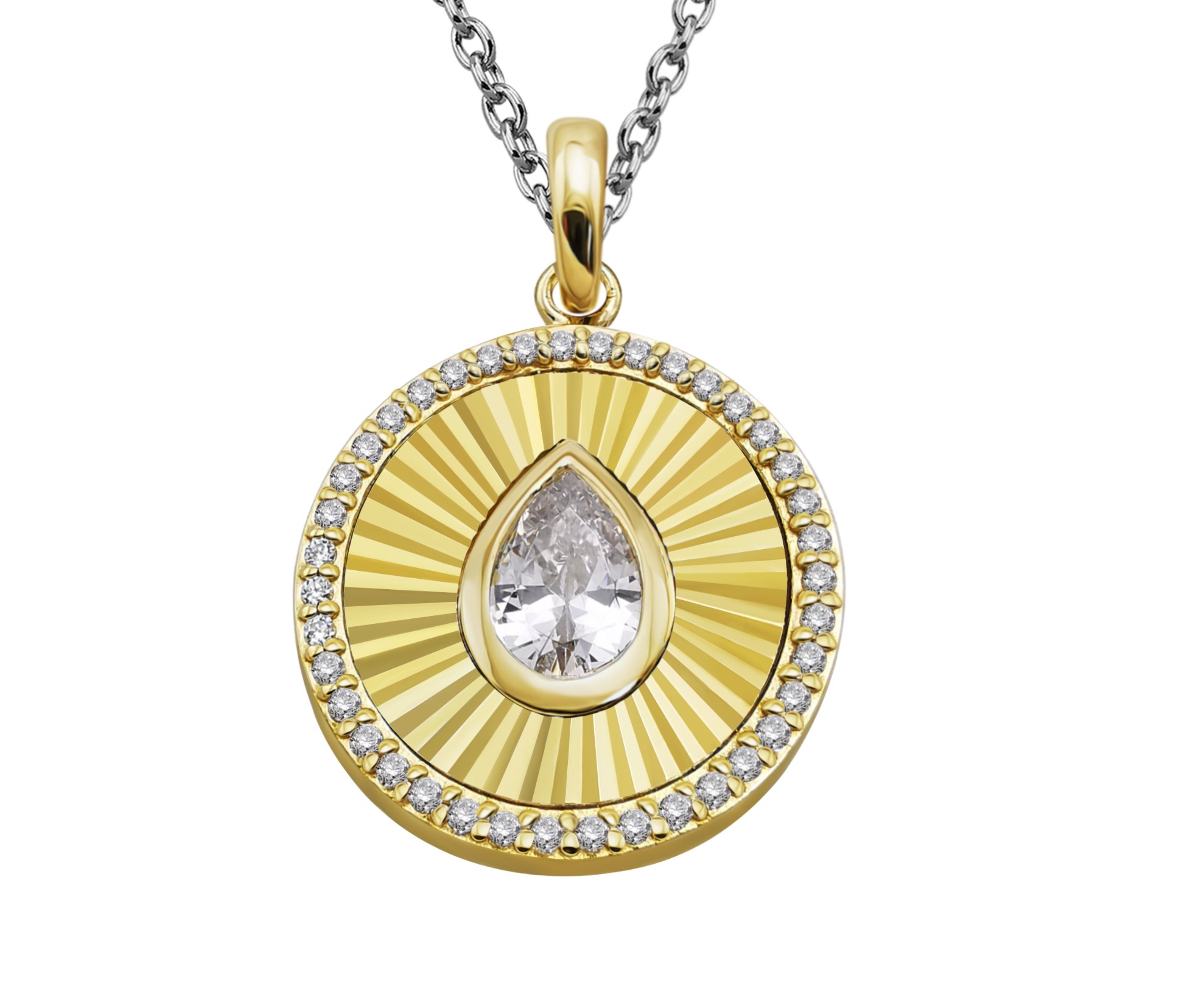 Sterling silver with gold plate circular pendant set with cubic zirconia suspended from a 18" sterling silver with gold plate chain.