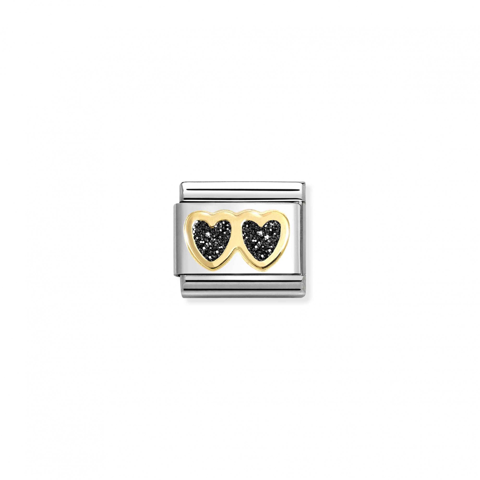 Original Nomination Classic Link in stainless steel and 18K yellow gold with Double Heart symbol with Black Glitter. Made in Italy. This Link is the perfect way to add a double touch of black to your bracelet!