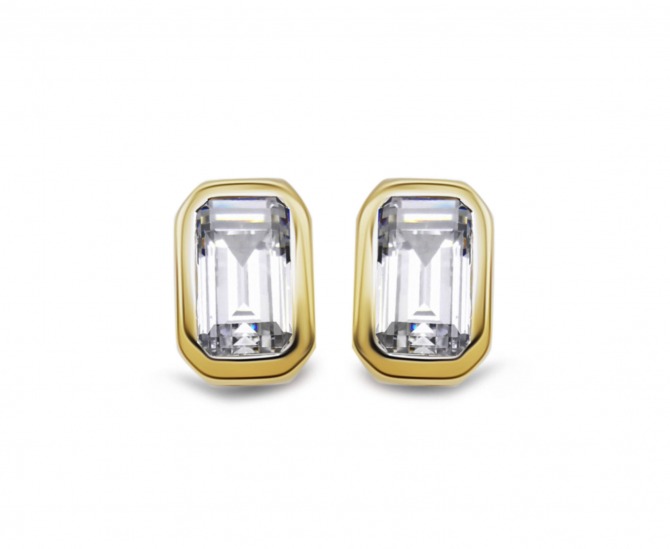 Sterling silver with gold plate stud earrings set with emerald cut cubic zirconia.