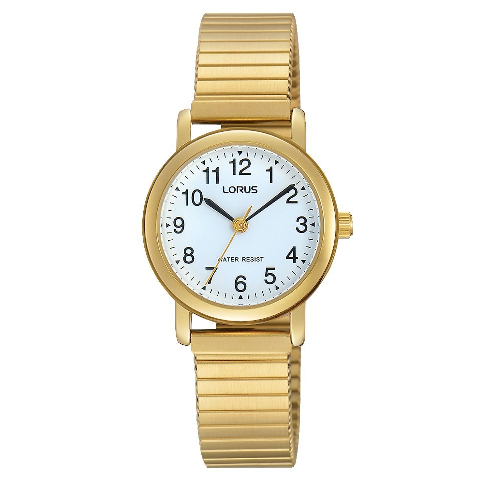 With distinctive black Arabic numbers and hands on a white dial, this ladies watch from Lorus is clear and easy to read. The 26mm gold plated stainless steel backed case houses the dial and the timepiece is finished with a gold tone expandable bracelet.