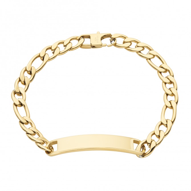 Stainless steel with gold plate figaro identity bracelet, 21cm in length.