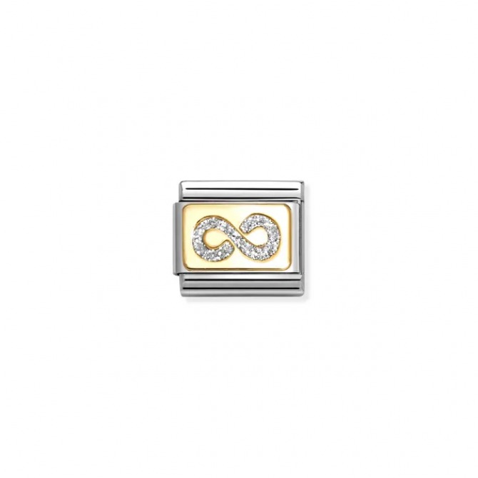 Original Nomination Classic Link in stainless steel and 18K yellow gold with Infinity symbol with Silver Glitter. Made in Italy. This Link is the perfect choice to symbolise a bond that will last forever.