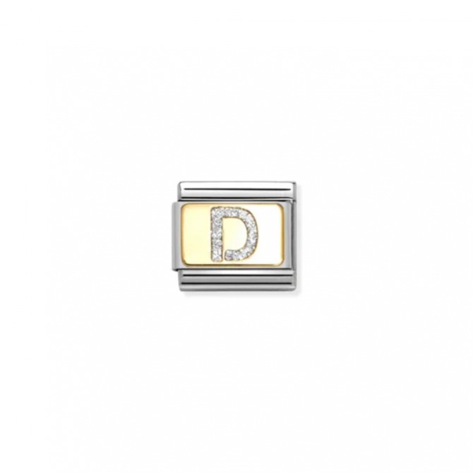 Original Nomination Classic Link in stainless steel and 18K yellow gold with Letter “D” symbol with Silver Glitter. Made in Italy. Give a bracelet with an initial Link to someone you care about.