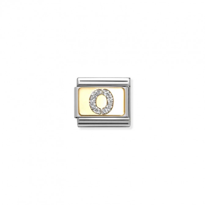 Original Nomination Classic Link in stainless steel and 18K yellow gold with Letter “O” symbol with Silver Glitter. Made in Italy. Glam up your bracelet with these glitter Letter Links: spell out a name or add an initial!