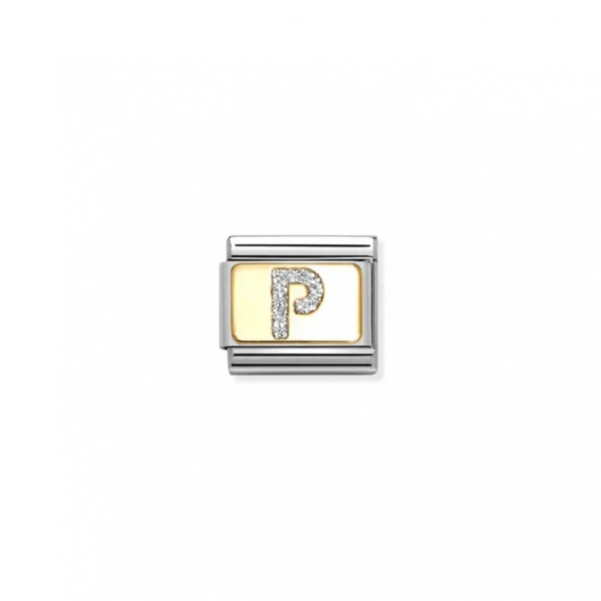 Original Nomination Classic Link in stainless steel and 18K yellow gold with Letter “P” symbol with Silver Glitter. Made in Italy. Create a Composable bracelet with a Letter Link and gems for someone special.
