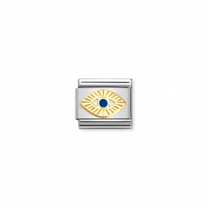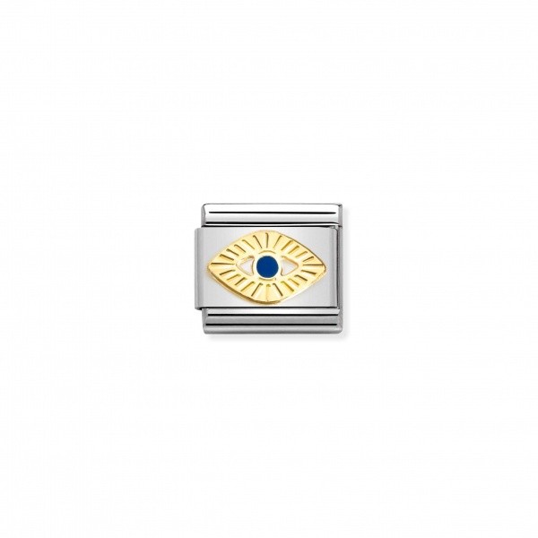 Original Nomination Classic Link in stainless steel and 18K yellow gold with Spirituality symbol Eye of God with etching and coloured enamel. Made in Italy. This Link with this striking eye that radiates light is an important symbol to add to your bracelet - or gift it as a symbol of protection to someone facing some challenges.