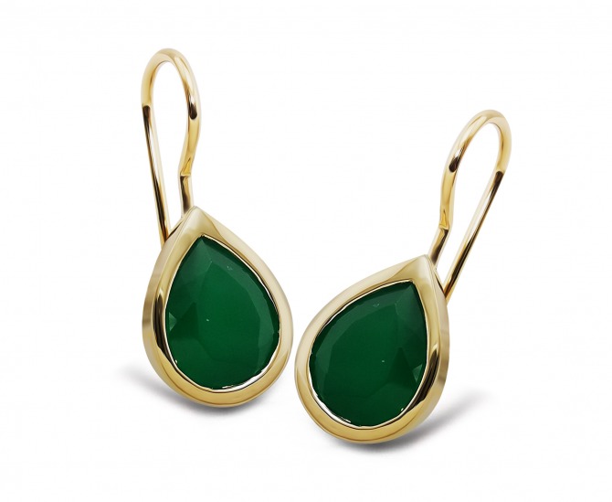 Sterling silver with gold plate teardrop shaped drop earrings set with green onyx.