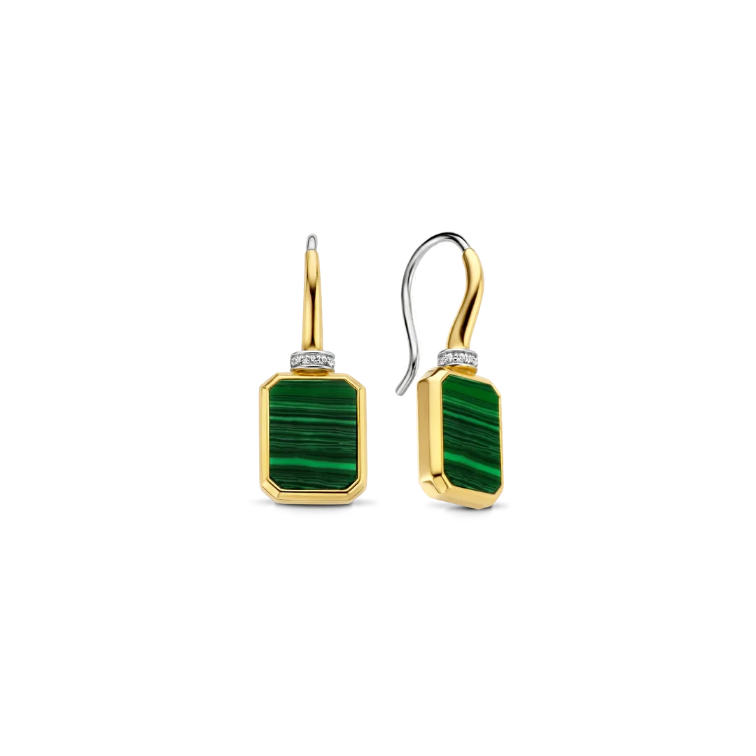 These TI SENTO gold-plated silver earrings 7859MA feature two rectangular malachite green stones handset in gold-plated settings. Their iconic rectangular shape will bring a touch of luxurious sophistication to any outfit. These gold-plated earrings are crafted from 925 sterling silver. Their dark and light tones of malachite green bring balance and sophistication to any outfit.