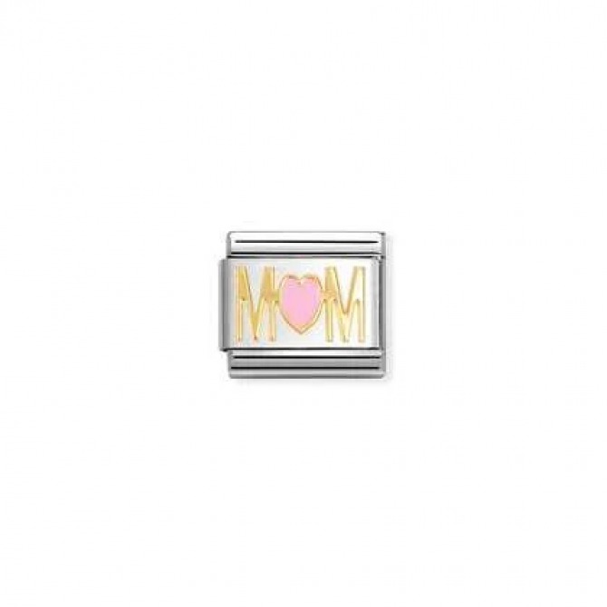 Original Nomination Classic Link for Composable bracelet in stainless steel with yellow bonded gold text MOM with Pink enamel Heart. Made in Italy. Choose this Link for a gift that truly comes from the Heart.