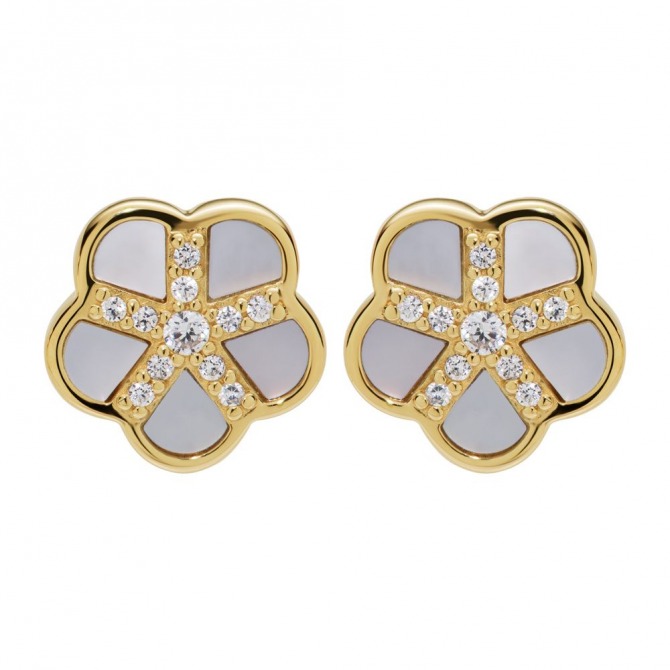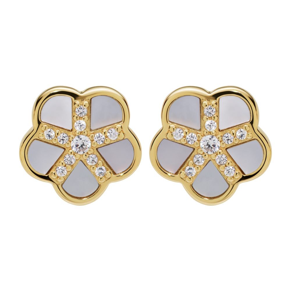 Gold & Mother of Pearl & CZ Flower Stud Earrings