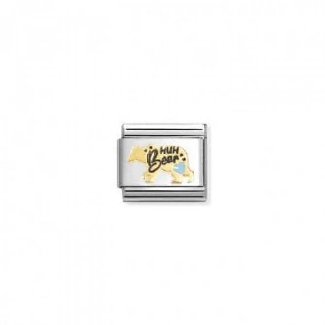 Original Nomination Classic Link for Composable bracelet in stainless steel with yellow bonded gold and black-engraved Bear symbol with text MUM BEAR with Light Blue enamel Heart. Made in Italy. Choose this Link to celebrate your very own Mummy Bear.