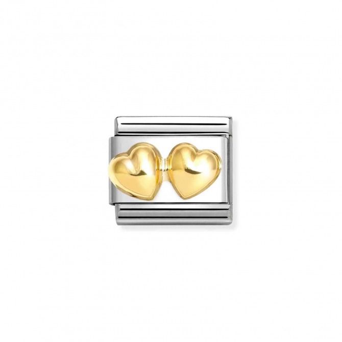 Original Nomination Classic Link in stainless steel and 18K yellow gold with Raised Double Heart symbol. Made in Italy. This Link is the perfect gift for someone who wants to celebrate Love!