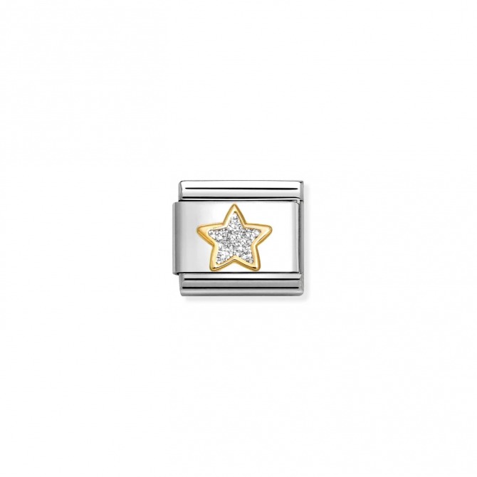Original Nomination Classic Link in stainless steel and 18K yellow gold with Star symbol with Silver Glitter. Made in Italy. This Link looks great as a single add-on or in pairs on to any bracelet.