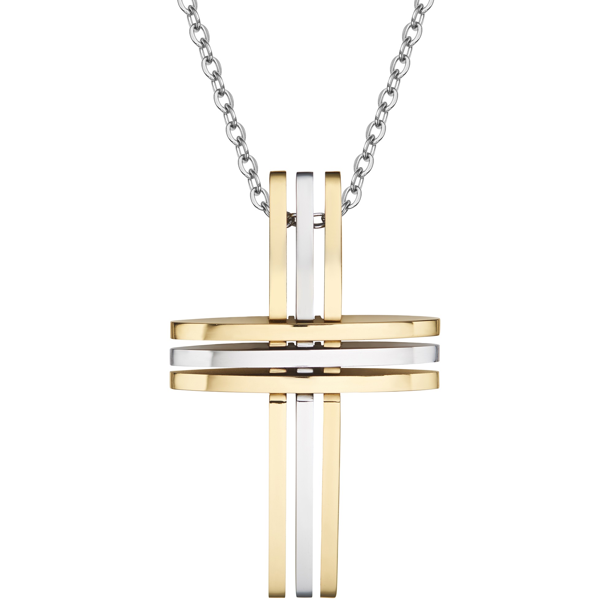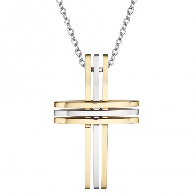 Stainless steel with gold plate, two colour cross pendant on a 50cm stainless steel chain.