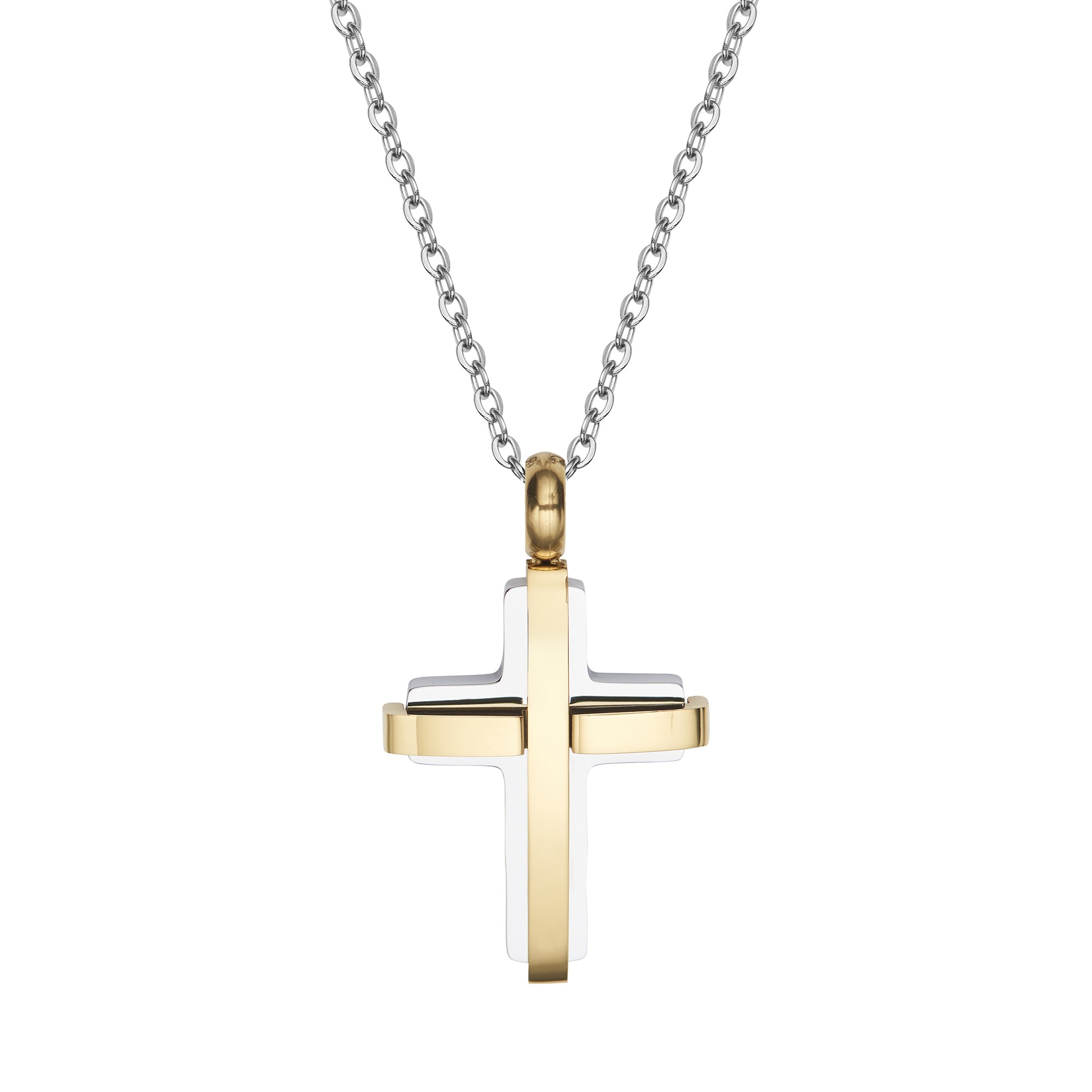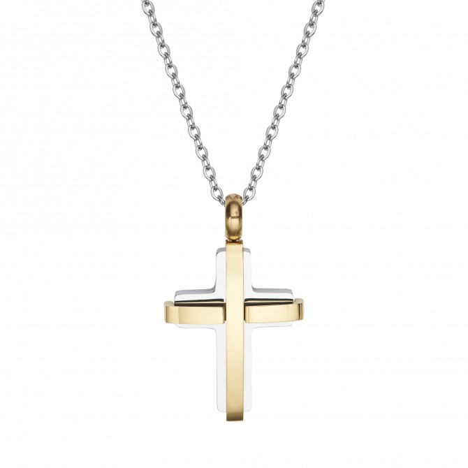 Stainless steel with gold plate, two colour cross pendant on a 50cm stainless steel chain.
