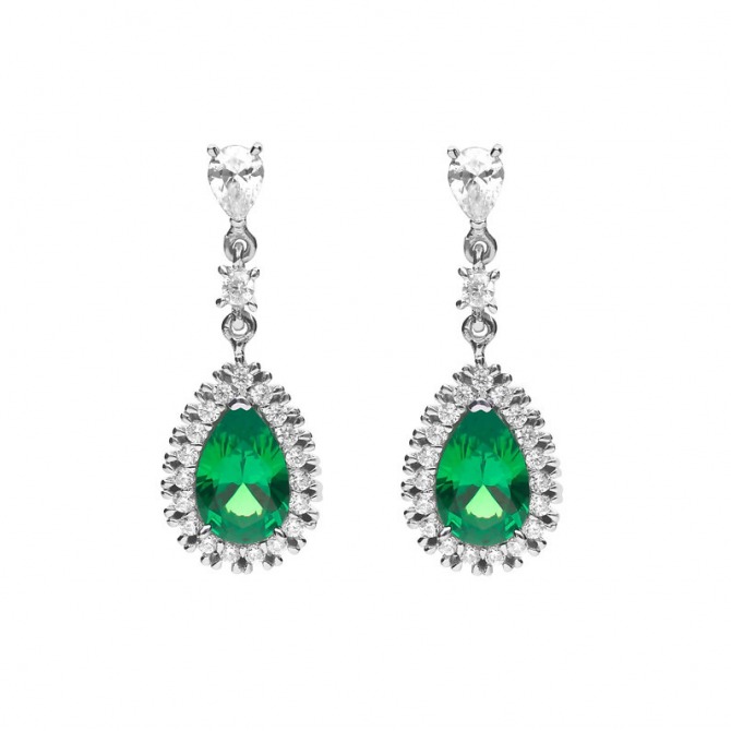 Silver & Green CZ Teardrop Earrings with Pave Surround