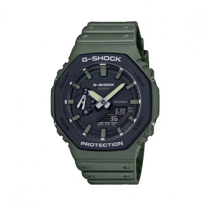 The GA-2110SU-3AER features a carbon fiber reinforced Carbon core guard structure, luminescent indexes & indexes that resemble those of an analog clock, a separate day of the week display, and a digital display in seconds and digital time.