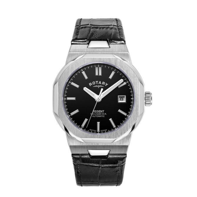 The striking Stainless Steel case & black leather strap of this Regent watch make for an eye-catching combination. With a black dial beneath sapphire glass showcasing simple hands and hour markers alongside a date window, the effect is one of minimalism and elegant functionality. Water resistant to 100m and powered automatically, this piece is optimised for the active wearer.