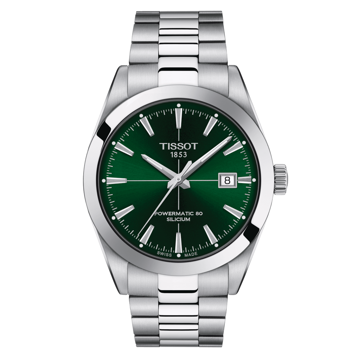 A stylish gents stainless steel watch with a 40mm case. The watch features smooth polished bezel a striking green dial with silver baton indexes silver hands & a date window at 3 o'clock. Powered by a Powermatic( automatic) movement with an 80 hour power reserve visible for the transparent case back. This watch is presented on a satin and polished 3 row bracelet with push button clasp