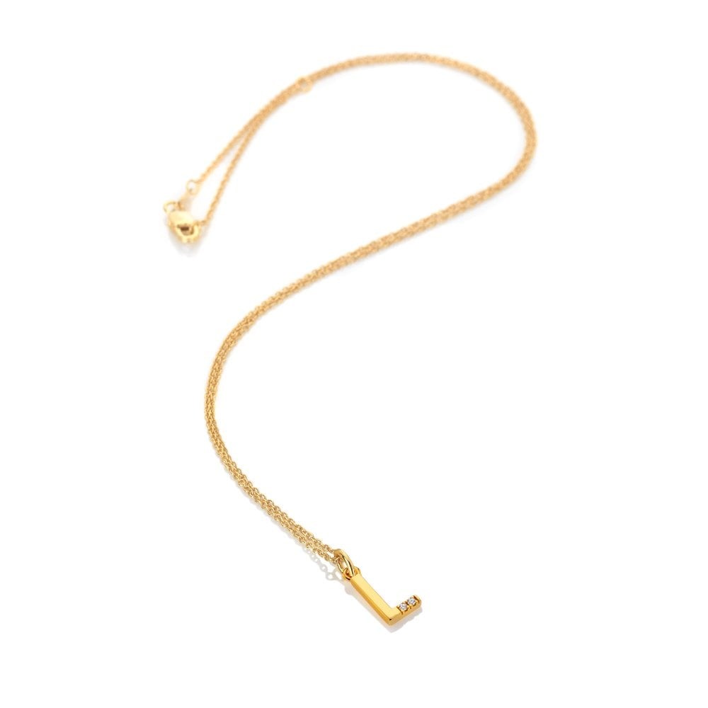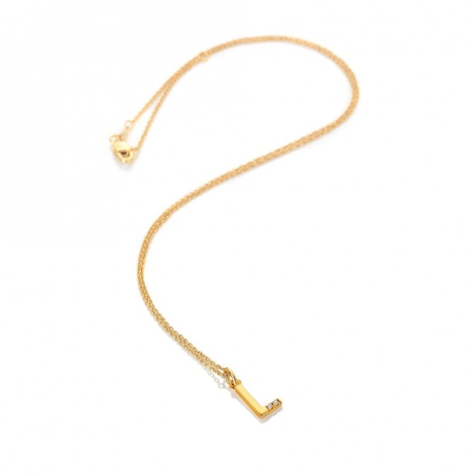 This gold plated sterling silver letter 'L' Micro Pendant is hand-set with two real 0.5 point diamonds. The letter sizing is 9mm x 7mm and a gold plated sterling silver chain is included that can be worn at either 40cm or 45cm - so versatile!