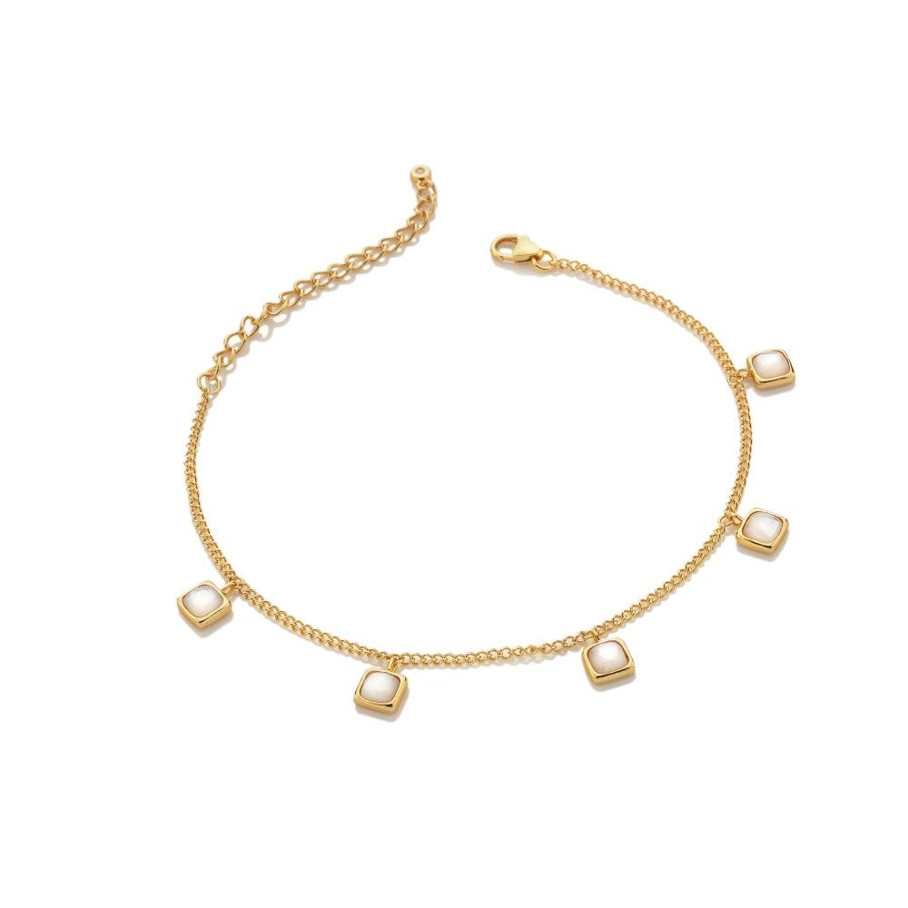 Discover the iridescent glow of Mother of Pearl showcased in 18ct Gold Plate jewels. Mother of Pearl is said to bring the wearer balance, harmony and calmness. Each drop on this bracelet is 6mm x 6mm and the chain is 19cm long with a 5cm extender.
