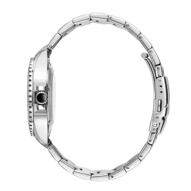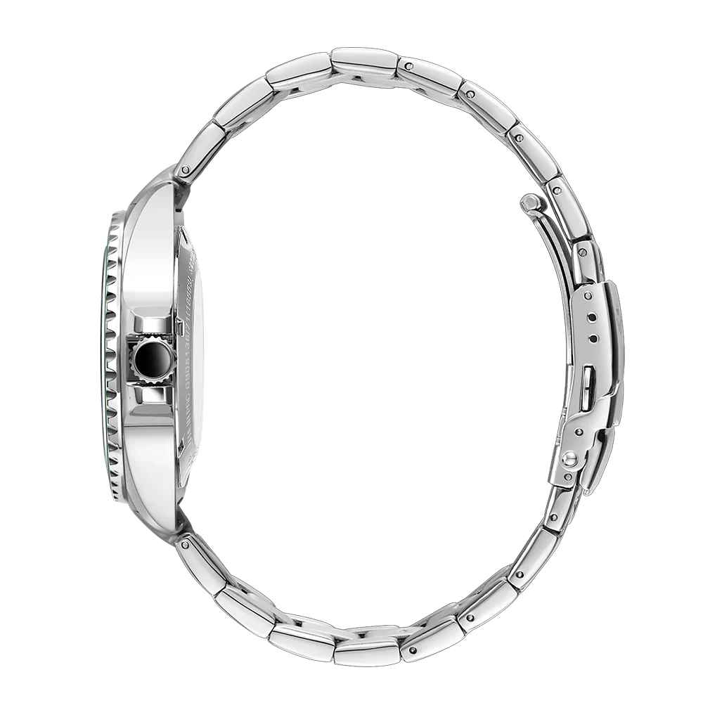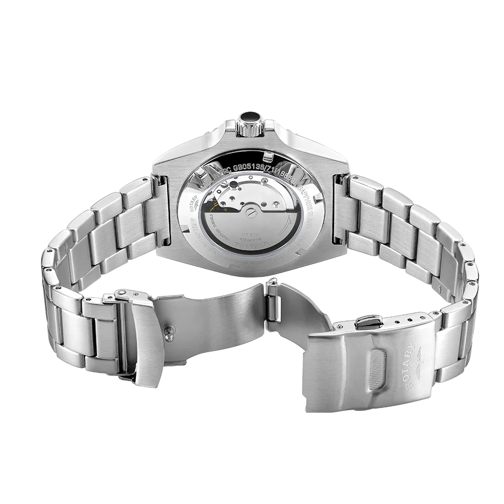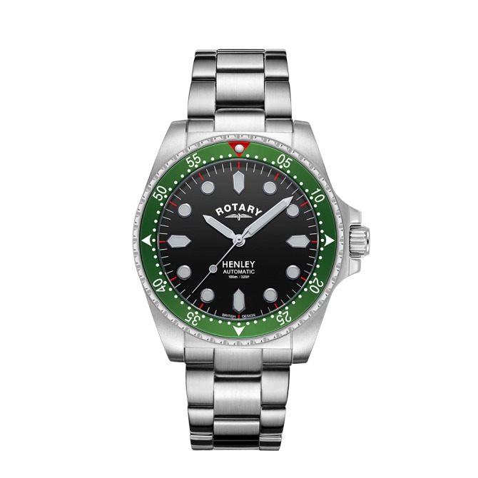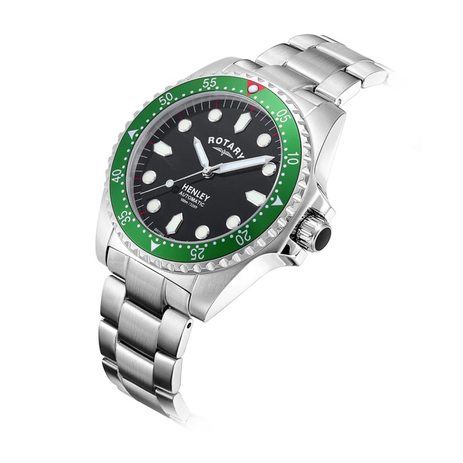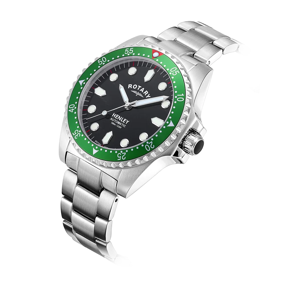 A superb sports watch in Rotary's portfolio, this Rotary Henley is an elegant partnership of high quality function and sporty elegance. Water resistant up to an impressive 100m, the timepiece is crafted with a sturdy 41mm Stainless Steel case and sapphire glass that protects its black dial. Large luminous hour markers & hands make for optimal visibility in darker environments, used in conjunction with the red luminous diver's dot on the unidirectional green bezel. Perfect for those who are often on the move, the watch is powered by an automatic Miyota 8215 movement. Made in stainless steel, the 3 link bracelet complements the protruding crown which helps elevate the contemporary aesthetic of the Rotary Henley.