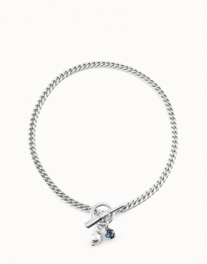 Sterling silver-plated necklace with two pearl charms and a blue faceted crystal with hoop and bar clasp.