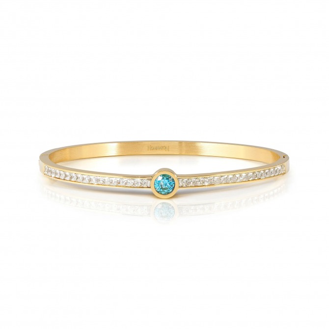 Stainless steel bangle bracelet with yellow PVD colour coated finish and White Cubic Zirconia, and Blue coloured central Cubic Zirconia. Each bangle is hinged on one side and has a hidden fastening that snaps securely closed on the other. Show off your styling creativity by wearing these bracelets together: Stack your style! Choose the stone colours that you like best. You can choose a simple silver tone bracelet and go for minimal elegance or add a colour coated PVD finish, when you want to add some vibrant colour to your look!