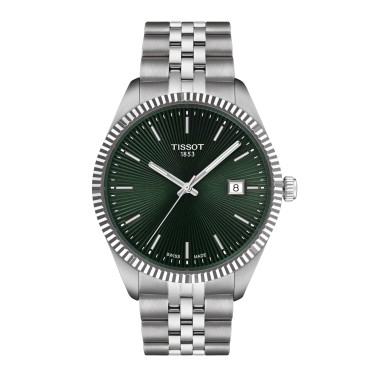 The watch has a round, stainless steel case with a green sunray dial featuring a day/date display and 50 metres water resistance. Fastened with a stainless steel bracelet.