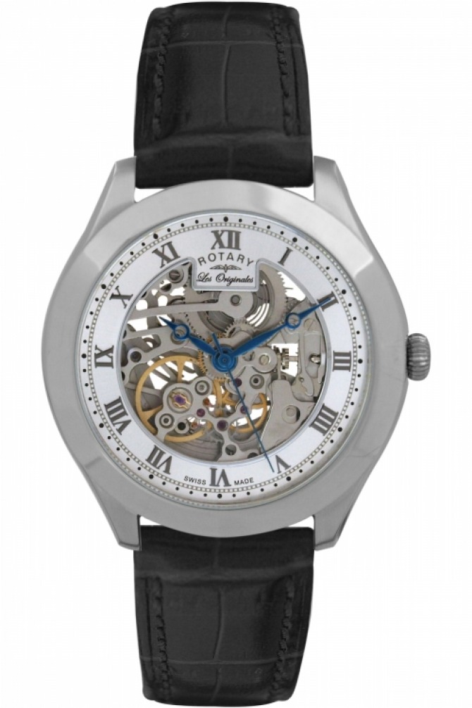 Rotary GS90508/02 Mens Jura Automatic Skeleton Watch is made from stainless steel and is powered by an automatic movement. It fastens a black leather strap and has a silver dial.