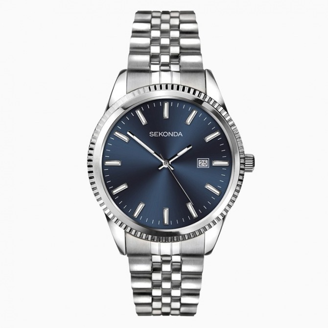 This timepiece features a silver coloured ionic plated case enclosing a stylish dark blue sunray dial with a date display. The watch is fastened with a slimline stainless steel bracelet that sits comfortably on the wrist.