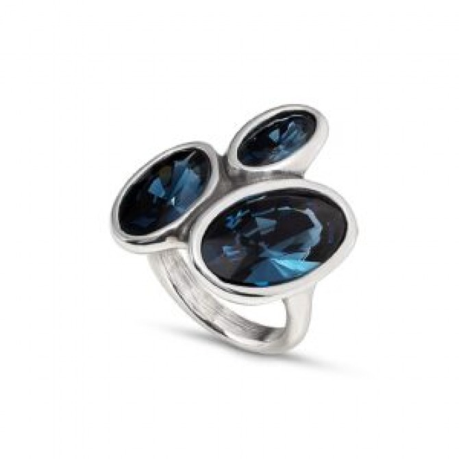 Ring featuring three oval bezel settings with blue crystals. This piece of jewelry was handmade in Spain from a silver-plated metal alloy using an entirely artisan process. Add a touch of color to any look with this unique ring.