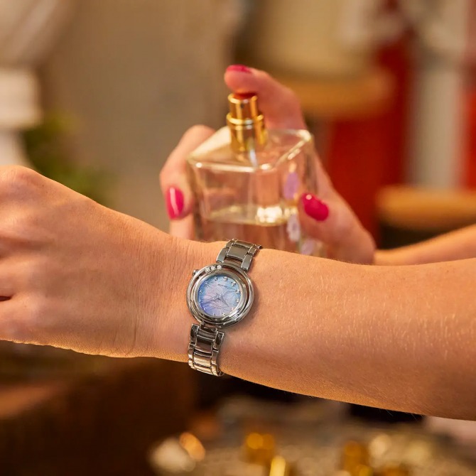 Classic lines and hints of romance make this newest piece to our women’s collection, the Citizen L Arcly, a captivating addition of sustainable luxury. With a design inspired by the original Citizen L "Sunrise", the distinctive stainless-steel timepiece is a charming accent on the wrist that makes the perfect statement. Sleek lines define the watch's 30mm silhouette, with a subtle 4 o'clock crown and 7 o'clock diamond accent adding to its entrancingly delicate look. On its blue mother-of-pearl dial, applied diamond markers and hands indicate the time in style atop a subtle flower motif. Suspended beneth the stainless steel case is a unique oblique ring design in which three diamonds float freely. The effect of this is a sparkling interplay of light on the wrist which is very elegant. Sustainably powered by any light with our proprietary Eco-Drive technology that never needs a battery, this elegant women's watch is the perfect addition to elevate any outfit. Water resistant to 50 metres.