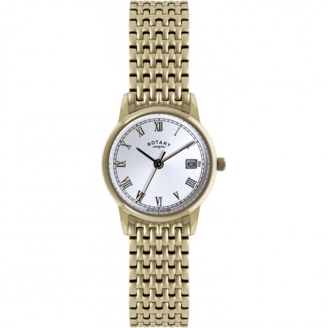Ladies Rotary watch with rose gold finish case and adjustable link bracelet, with double push button fold over butterfly clasp. Quartz battery operated with champagne dial, rose gold coloured Roman numerals and 3 hands. Date at 3 O'Clock position. 100M water resistant - suitable to jump into a swimming pool.