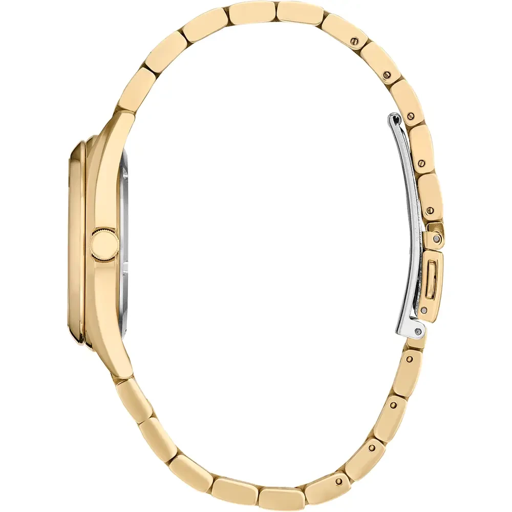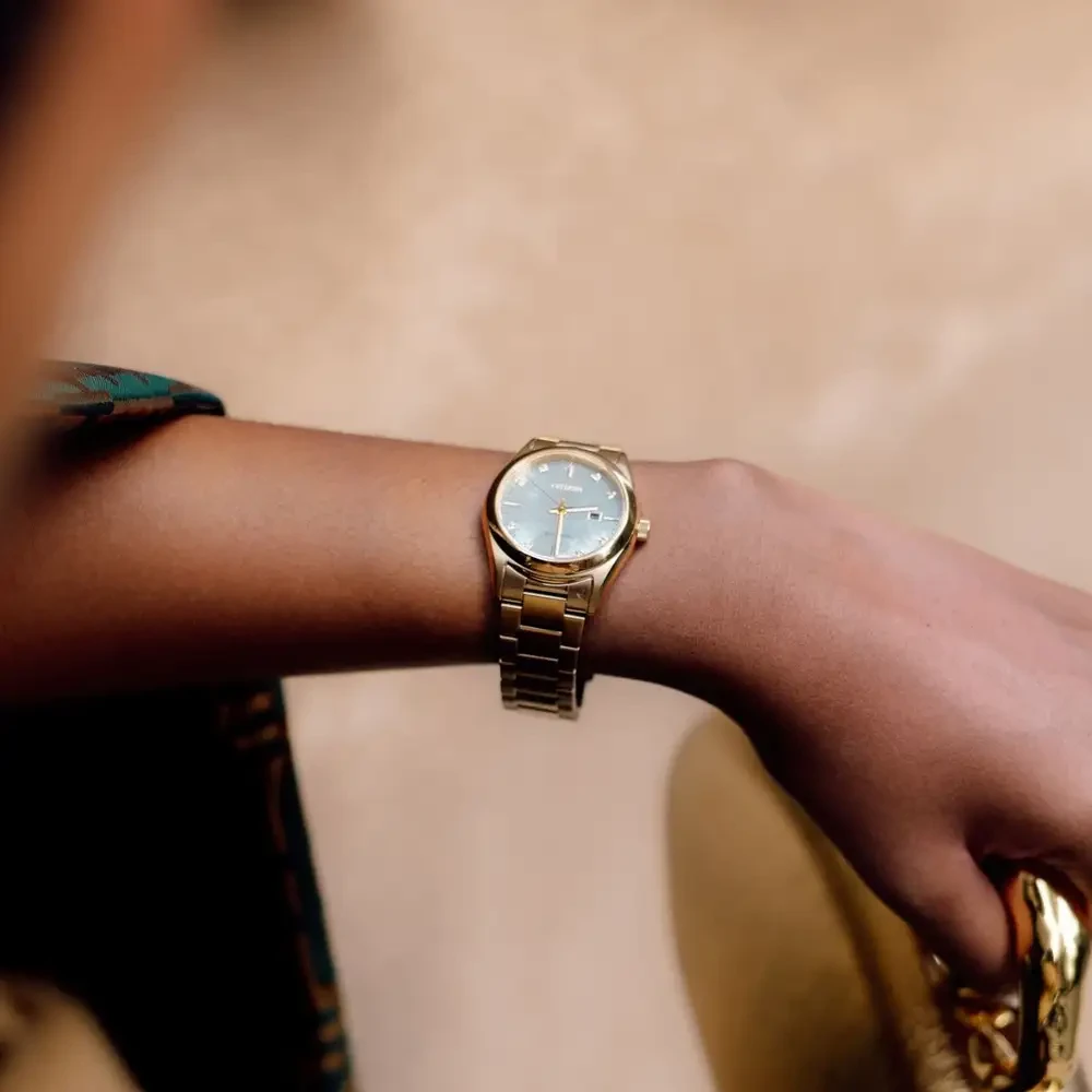 Elevate your daily looks with this timepiece from Citizen. Fusing wear ability with feminine elegance, this timepiece is the ultimate day-to-evening watch to wear. The gold-tone stainless steel case measures 33mm in diameter and is presented on a gold-tone, 3-link stainless steel bracelet for a sleek, versatile wear on the wrist. The mother-of-pearl* dial features 8 diamond accents. With water resistance up to 100 metres and date display at the 3 o'clock position. Powered by Citizen’s proprietary Eco-Drive technology to provide light-powered vitality continuously and sustainably without ever needing a battery.