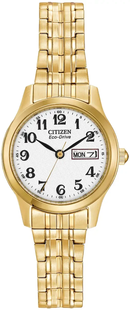 Design and comfort unite in the Citizen Eco-Drive Expansion collection, offering timepieces with universal appeal. Key features of this 3-hand analogue watch in gold-tone stainless steel include day-date indicator, white dial, 25mm case and 30 metre water resistance. Featuring Eco-Drive technology – powered by light, any light. Never needs a battery.