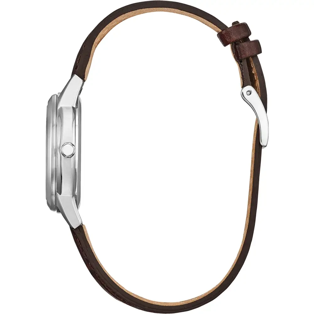 Timeless appeal that never goes out of style, this 30mm Ladies’ Strap timepiece is styled with a leather strap, silver-tone dial with date display and roman numerals at 12 and 6 o’clock. With Eco-Drive technology, this watch is sustainably powered by any light and never needs a battery.