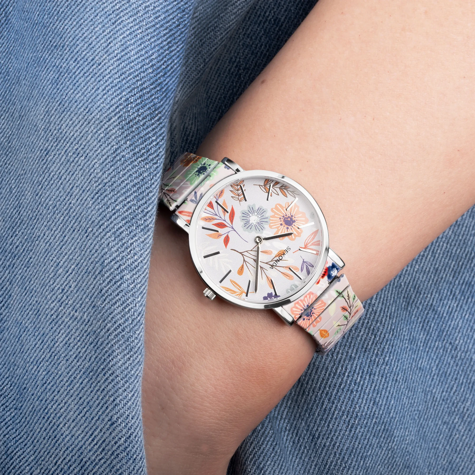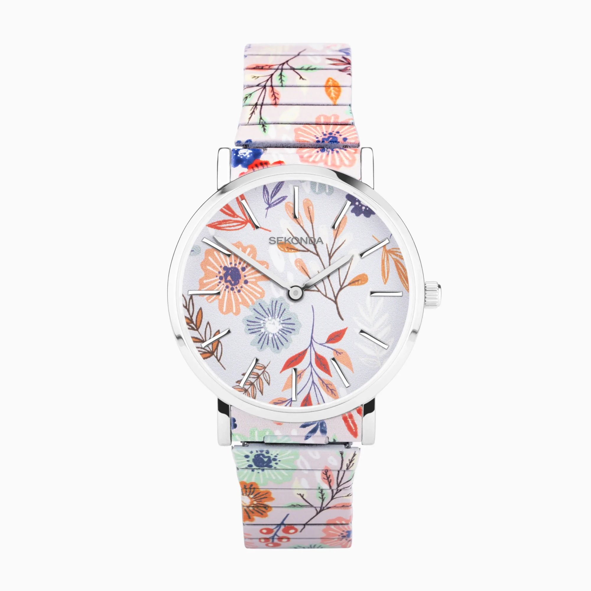 The watch has a round, ion-plated silver alloy case with a floral patterned dial. The watch is fastened with a floral patterned, stainless steel expander bracelet. The bracelet is a standard 150mm expandable bracelet, links can be removed from the centre of the bracelet, but this may result in a misalignment of the pattern where two links meet.