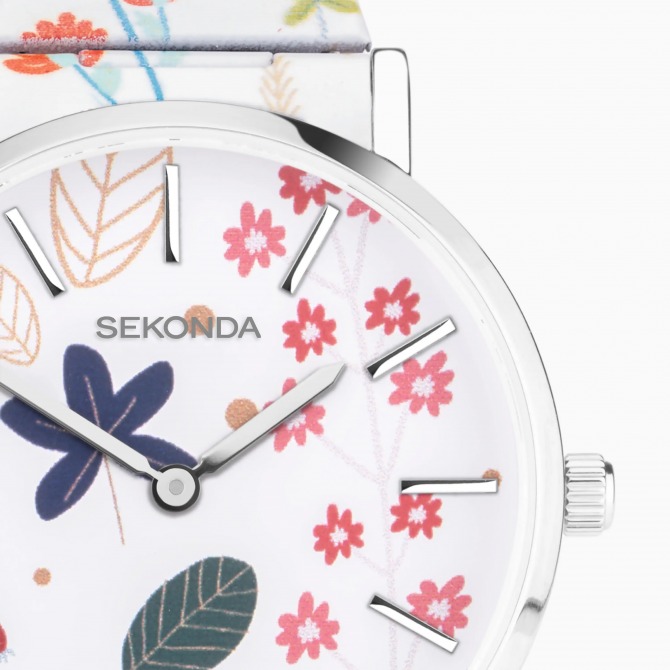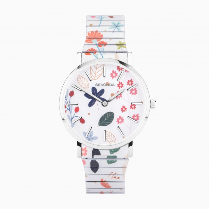 The watch has a round, ion-plated silver alloy case with a woodland patterned dial. The watch is fastened with a woodland patterned, stainless steel expander bracelet. The bracelet is a standard 150mm expandable bracelet, links can be removed from the centre of the bracelet, but this may result in a misalignment of the pattern where two links meet.