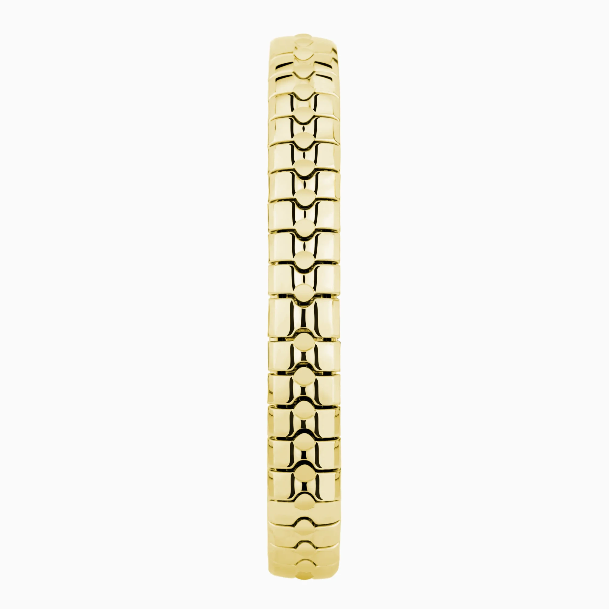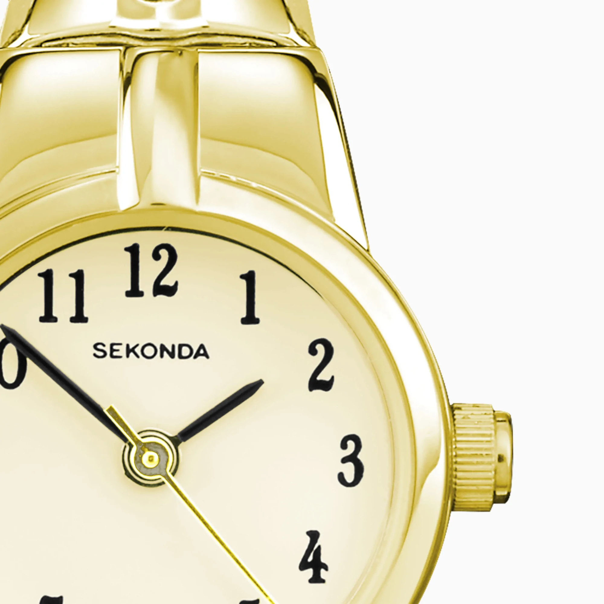 This watch has a round, ion-plated gold alloy case with a champagne coloured dial and black printed numbers. The watch fastens with an ion-plated gold stainless steel expander bracelet.