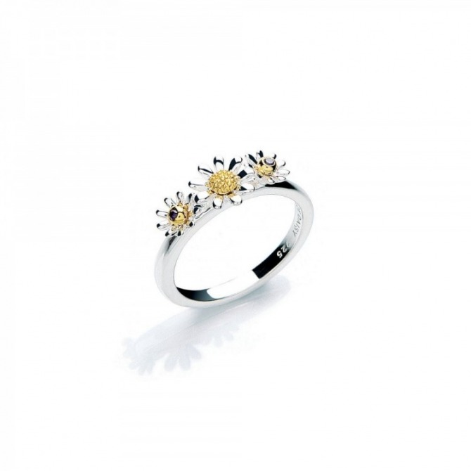 3 gorgeous daisies sit atop Daisy's Lambda Stack Ring. Mix up textured finishes with stones and pearls and stack with your own vintage treasures for a totally unique look.
