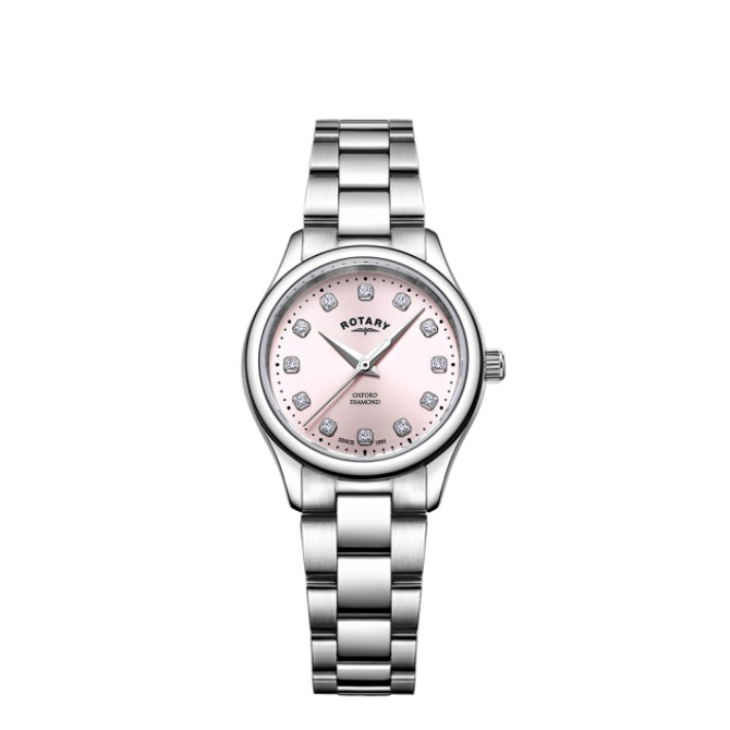 This Oxford features a pink sunray dial with 12 diamond markers. It features a 28mm Stainless Steel case & is water resistant to 50m. It is powered by a quartz movement, and has a Stainless Steel three link bracelet secured with a deployment clasp. Each is accompanied with official diamond certification.