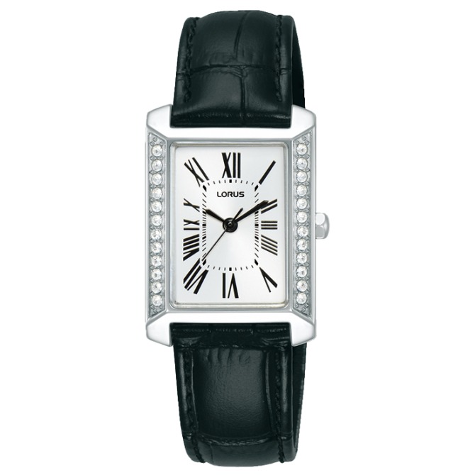 This timepiece is designed for classic luxe style. Its rectangular dial showcases a bright silvery-white sunray effect while the silver-coloured hands and Roman numeral hour markers complement the overall aesthetic, creating a harmonious and refined look, paired with a black strap for an all over standout timepiece.