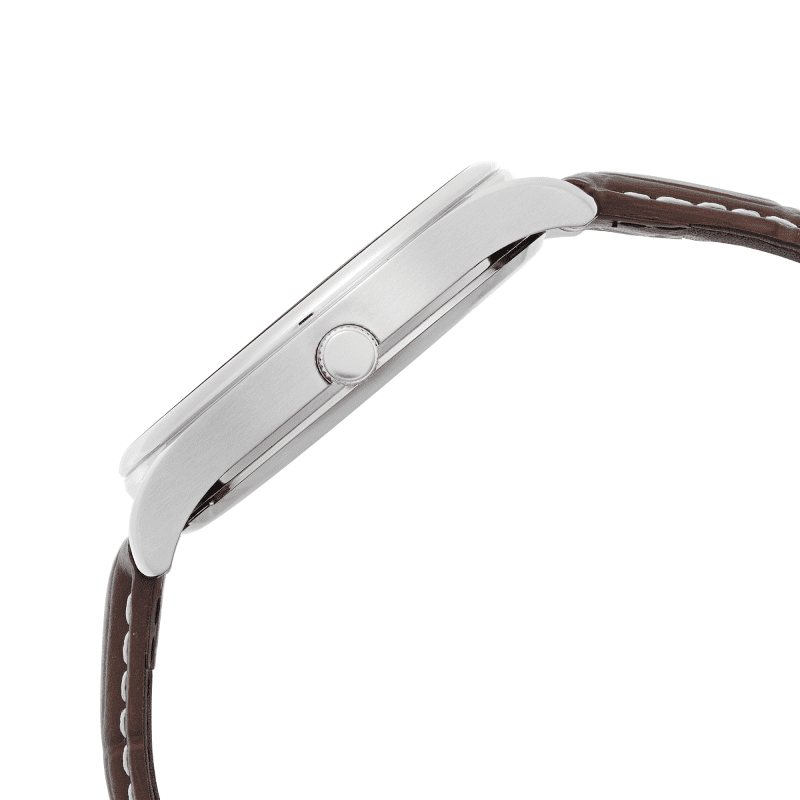 The ‘lake blue-green’ dial is further enhanced by silver-coloured dauphine hands and indices and an easy-to-read date indicator at 3 o’clock with a stainless steel case and dark brown leather strap.